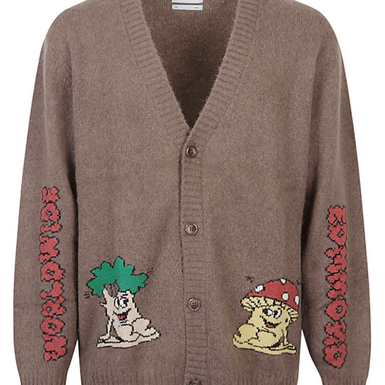 Brown cardigan, closing with buttons, v -neck, with embroidery. wool blend v-necked cardigan size and fit - this piece fits true to size. we recommend you get your regular size. model is 1,84m / 6ft 1in wearing size m