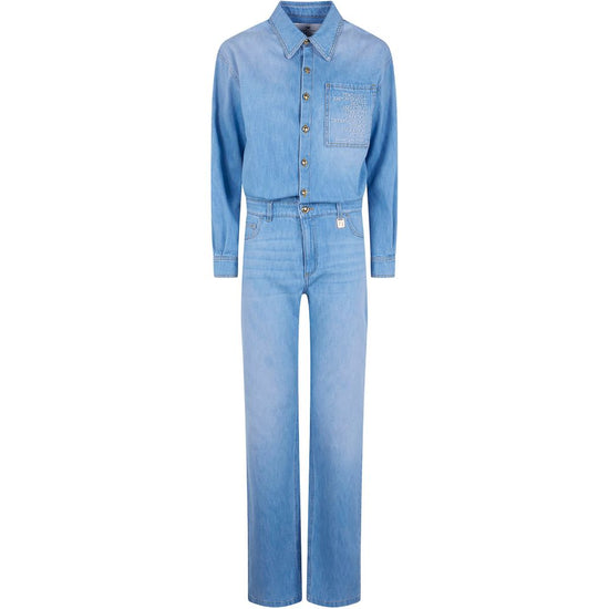 Blue front button-fastening chest-pocket logo-embroidery long-sleeves gold-tone buttons denim cotton jumpsuit