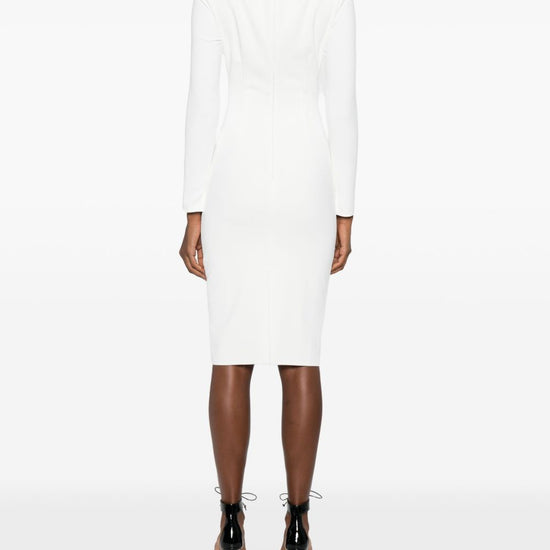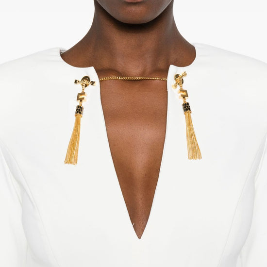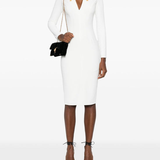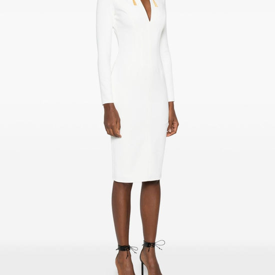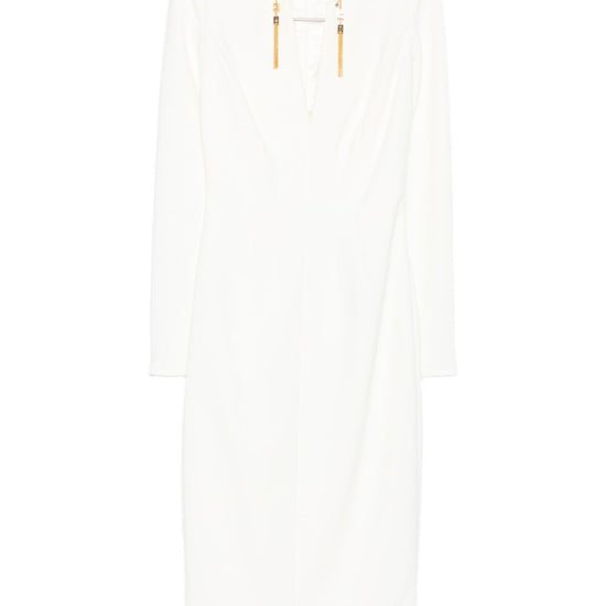 White v-neckline long sleeves gold-tone tassel embellishments fitted silhouette concealed zip fastening v-necked midi dress