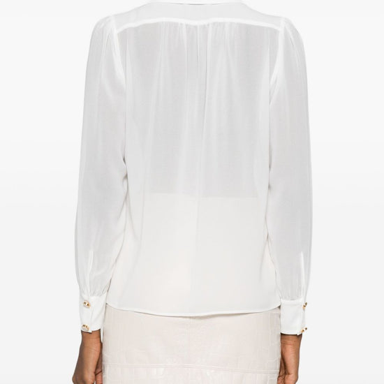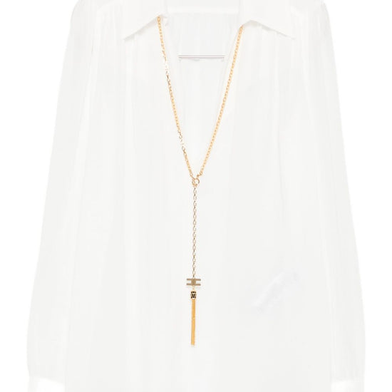 White long sleeves spread collar chain detail tassel pendant button fastening v-necked shirt