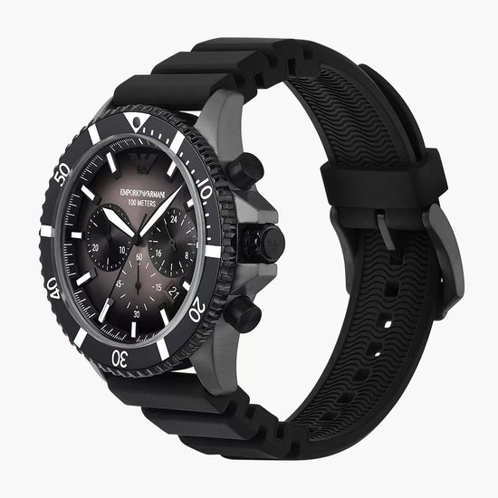 refine your sporty style with the emporio armani ar11515 men's chronograph watch. this dynamic timepiece is designed for the active man who values both functionality and a bold aesthetic. featuring a sleek black dial, a black silicone strap, and a durable black case, the ar11515 is perfect for both outdoor adventures and casual outings.
