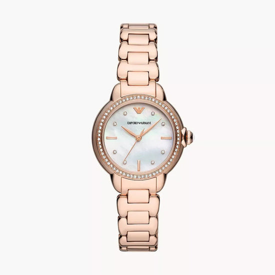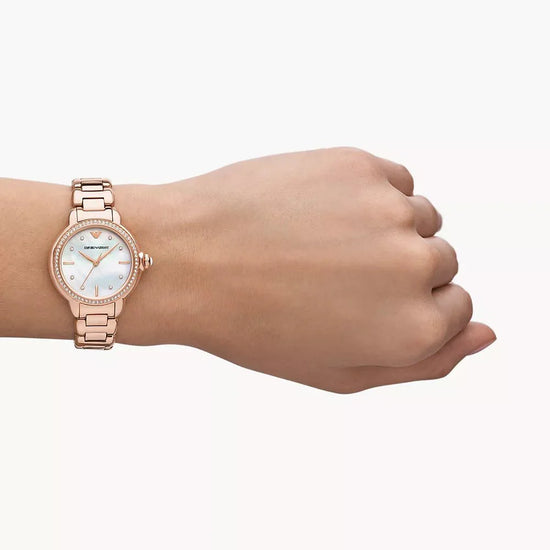 indulge in timeless elegance with the emporio armani ar11523 women's watch. this exquisite timepiece is designed for the modern woman who values both luxury and style. featuring a sophisticated rose gold-tone finish with a beautiful mother-of-pearl dial, and a sparkling crystal-embellished bezel, the ar11523 is perfect for any occasion, from formal events to casual outings.