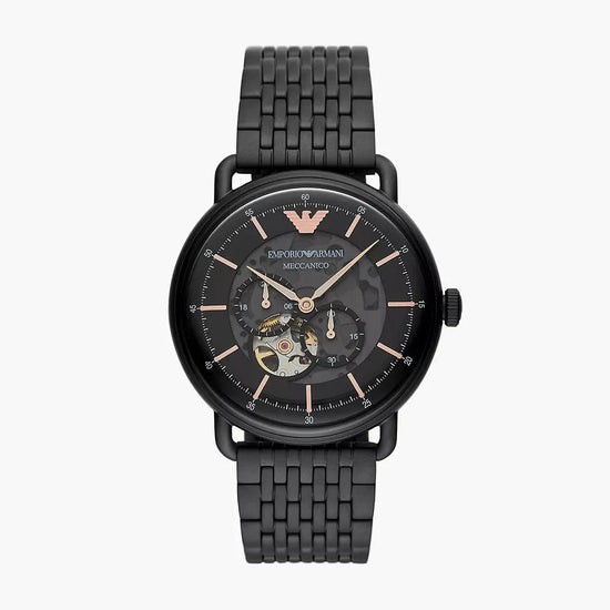 unveil the elegance of mechanical precision with the emporio armani ar60025 men's meccanico watch. this exquisite timepiece is designed for the modern man who values both luxury and craftsmanship. featuring a captivating black skeleton dial that reveals the intricate inner workings, a polished black stainless steel case, and a matching black stainless steel bracelet, the ar60025 is perfect for any occasion, from formal events to casual outings.