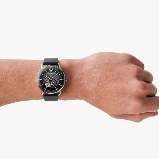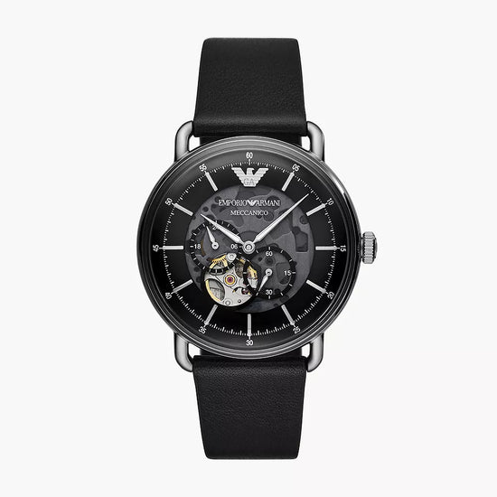 discover the allure of mechanical precision with the emporio armani ar60026 men's meccanico watch. this sophisticated timepiece is designed for the modern man who values both luxury and craftsmanship. featuring an elegant black skeleton dial that reveals the intricate inner workings, a polished black stainless steel case, and a black leather strap, the ar60026 is perfect for any occasion, from formal events to casual outings.