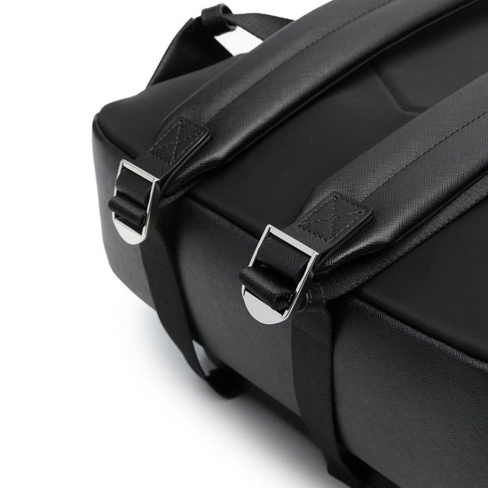 Black recycled leather logo print to the front silver-tone hardware two padded adjustable shoulder straps single top handle all-around zip fastening front zip-fastening pocket main compartment full lining logo backpack