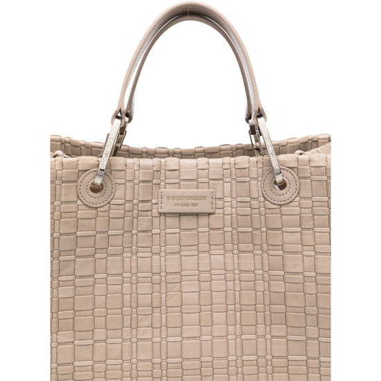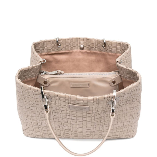Beige top handles detachable strap silver-tone hardware this piece comes complete with a protective dust bag. myea medium shopping bag