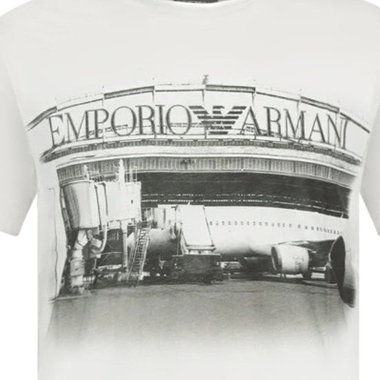step into style with the emporio armani boarding capsule collection white t-shirt. this t-shirt captures the essence of jet-set chic with its bold photographic print of an aeroplane, paying homage to the thrill of travel. the front features the iconic emporio armani logo in a commanding overlay, making it an instant statement piece. crafted from soft, breathable cotton, this t-shirt offers both comfort and durability, making it perfect for everyday wear or your next adventure. the sleek, white background serves as a canvas for the stark, contrasting image, creating a modern look that's both eye-catching and stylish. pair it with jeans for a casual outing, or layer it under a blazer for a more upscale approach. this t-shirt isn't just a garment; it's a passport to the world of armani—timeless, elegant, and always in motion.