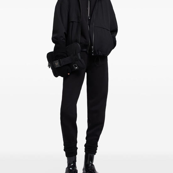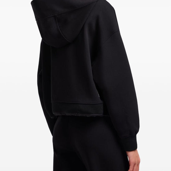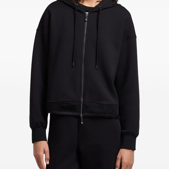 Black hooded neckline zip fastening long sleeves ribbed cuffs quilted hem cotton blouson jacket