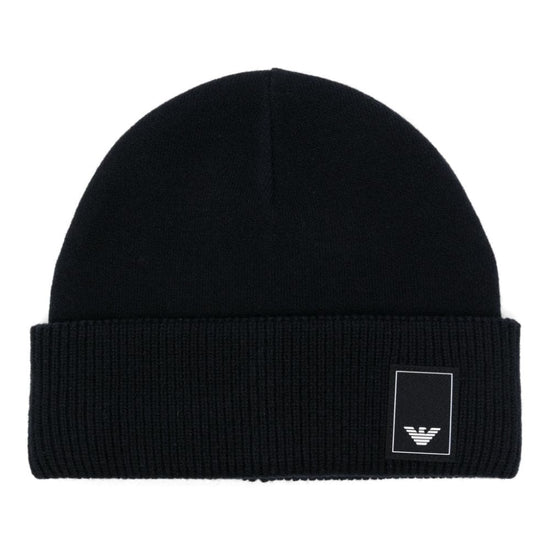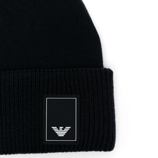 Navy blue virgin wool blend knitted construction logo patch to the front turn-up brim wool beanie