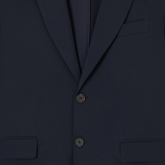 Navy blue notched lapels button fastening flap pockets long sleeves straight hem single-breasted jacket