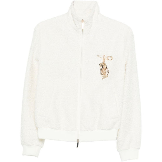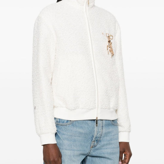 Off white textured knit appliqué zip fastening ribbed hem ribbed cuffs tweed blouson jacket