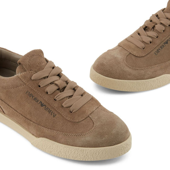 Light brown suede upper lace-up fastening flat sole low-top design logo detail suede leather sneakers
