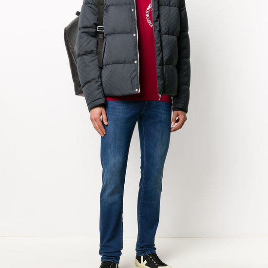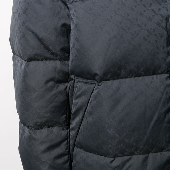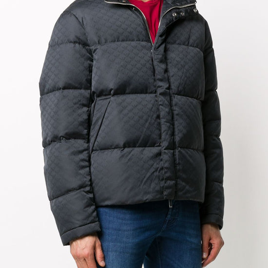 Dark blue padded design front zip fastening front press-stud fastening long sleeves two side slit pockets nylon short down jacket