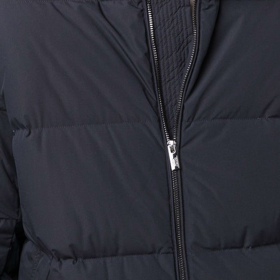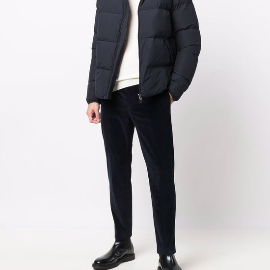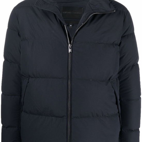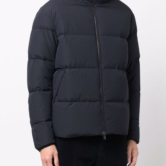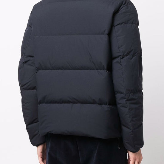 Navy blue down-feather filling band collar padded design front zip fastening long sleeves two front welt pockets nylon short down jacket