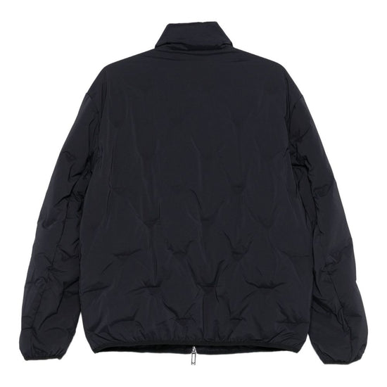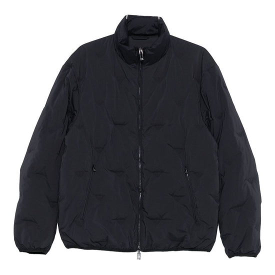 Dark blue zip fastening high neck side zip pockets long sleeves elasticated hem nylon short down jacket