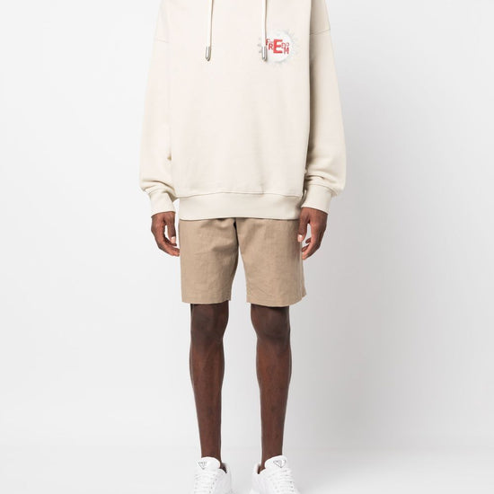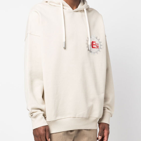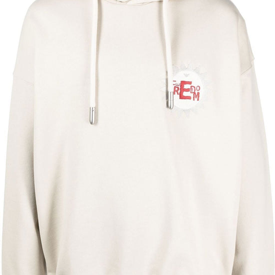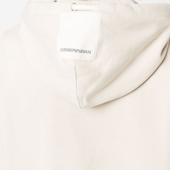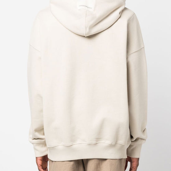 Long sleeve hoodie from emporio armani featuring light beige, cotton blend, embroidered logo at the chest, drawstring hood, long sleeves, elasticated cuffs and elasticated hem. logo, taschine logo cotton hoodie size and fit - this piece fits true to size. we recommend you get your regular size. model is 1,84m / 6ft 1in wearing size m