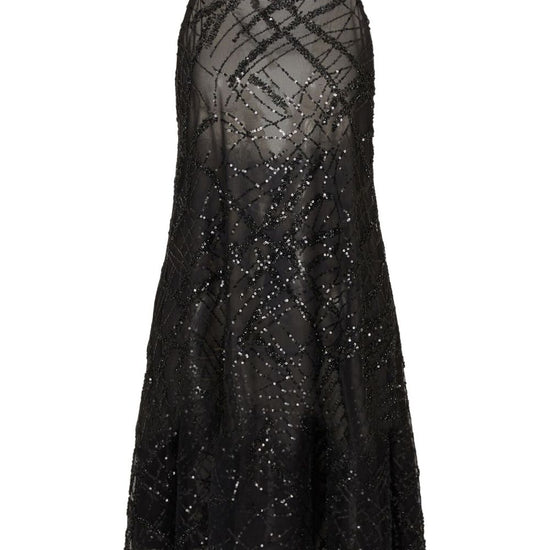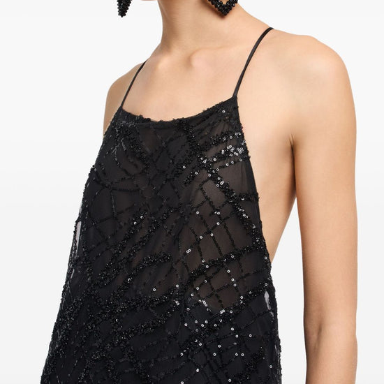 Black sequin embellishment backless design spaghetti straps a-line skirt sheer overlay long dress