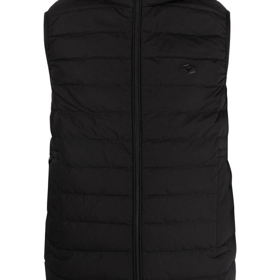 Black duck feather quilted finish logo plaque two side inset pockets front zip fastening high neck sleeveless nylon down vest