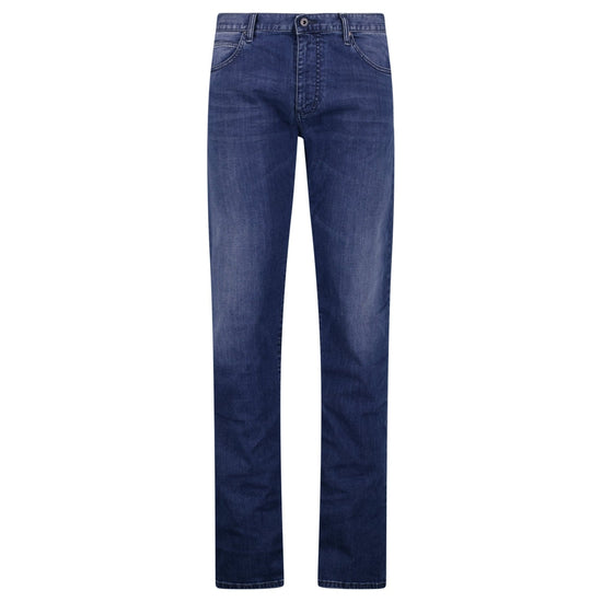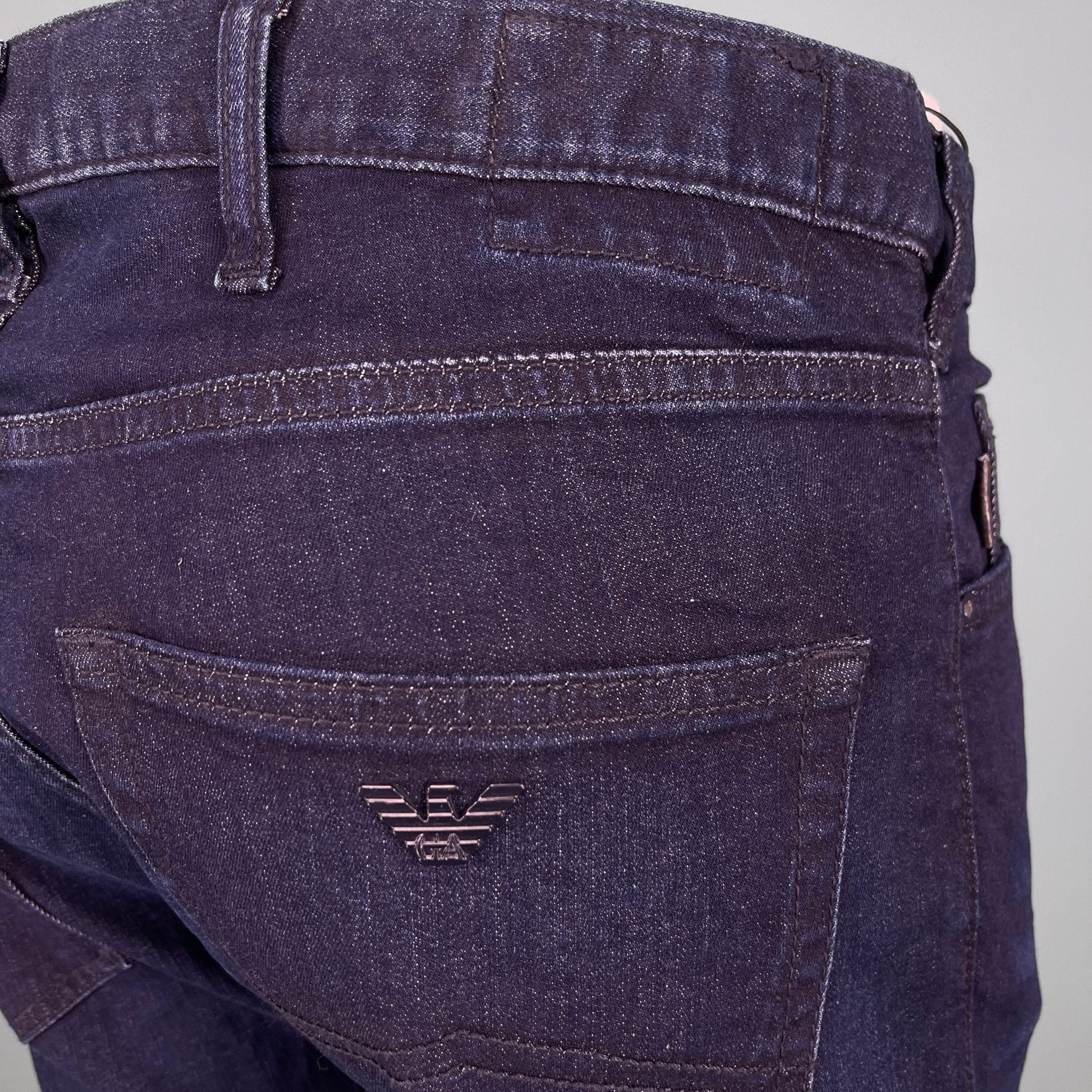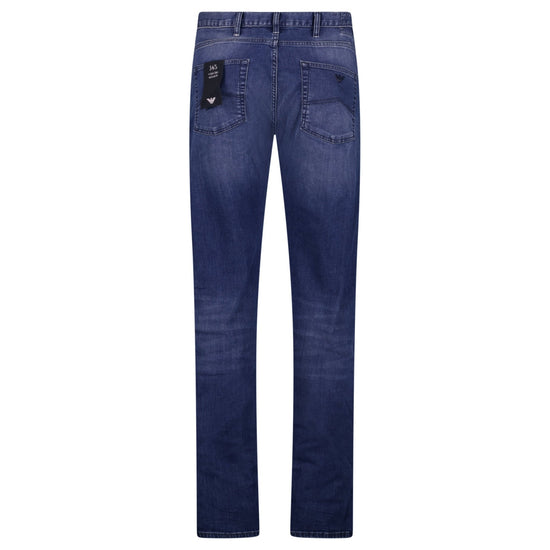 Emporio Armani J45 Regular Fit 5 Pocket Black Eagle Distressed Belt Patch Jeans Blue