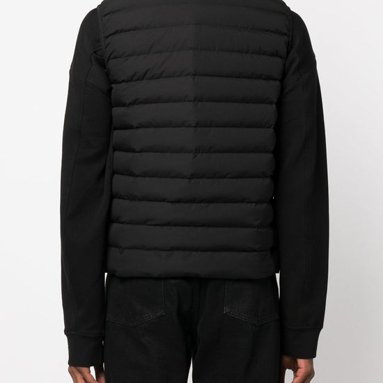Black duck feather quilted finish logo plaque two side inset pockets front zip fastening high neck sleeveless nylon down vest