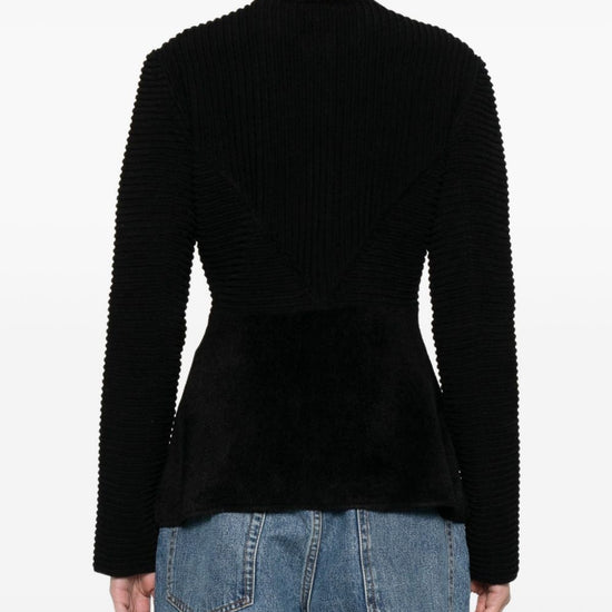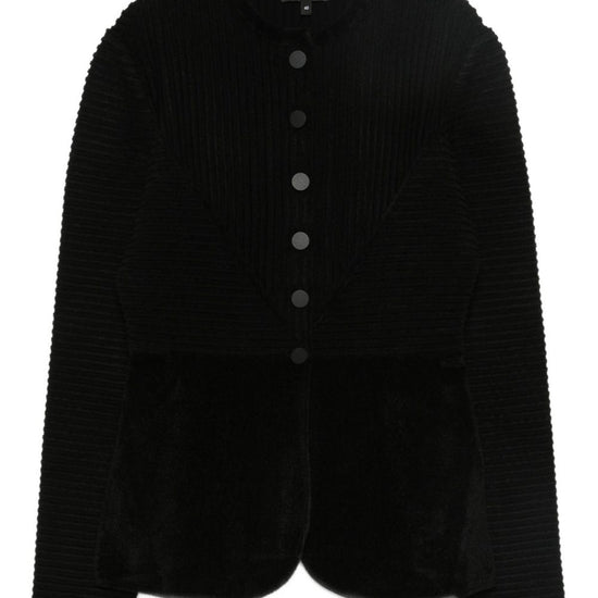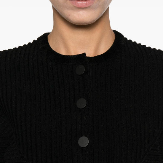 Black textured finish button fastening front pockets round neck long sleeves buttoned crewneck jacket