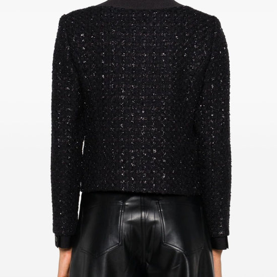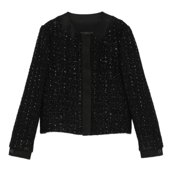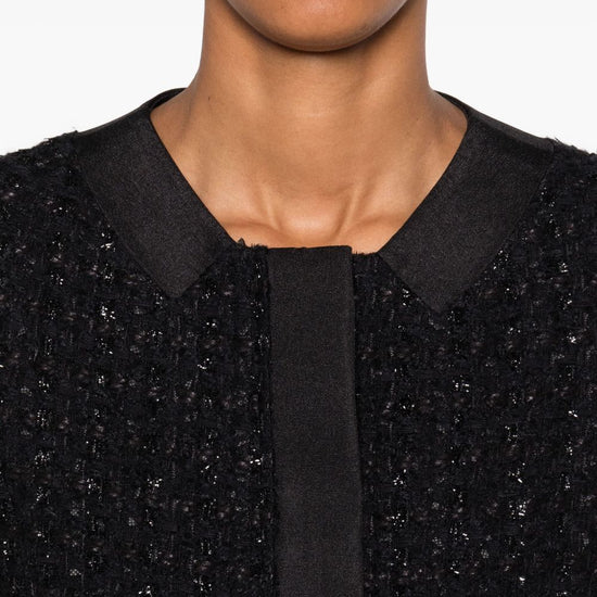 Black tweed texture button fastening long sleeves round neck cropped hem wool blend blazer jacket