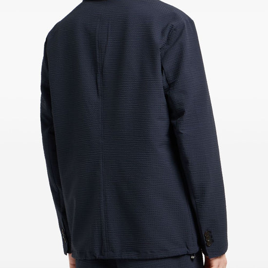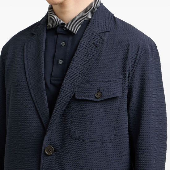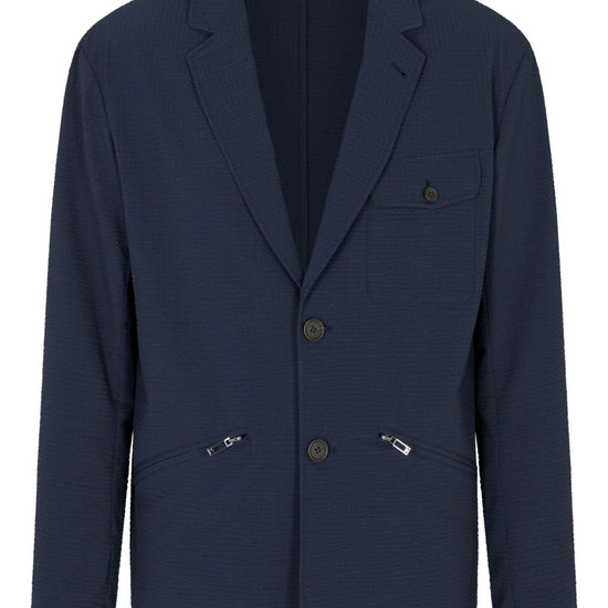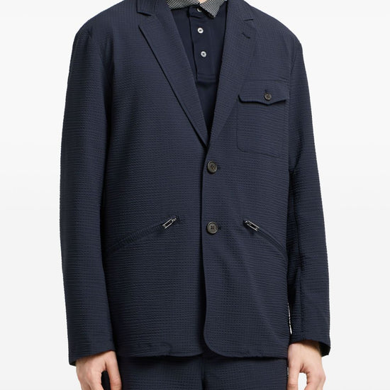 Navy blue textured weave two button fastening patch pocket zip detail pockets notched lapel single-breasted blazer jacket