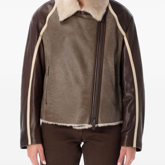 Brown fur collar zip fastening buckle detail panelled design side zip pockets leather jacket