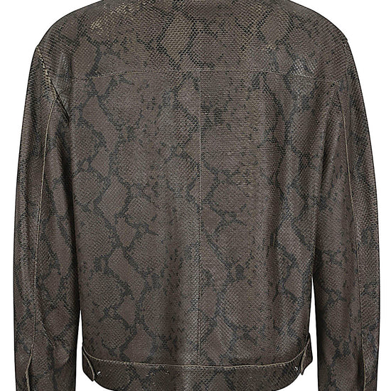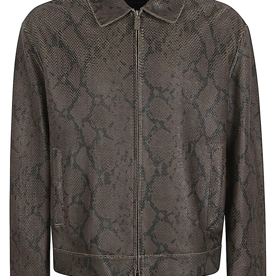 Blouson with a front zip, made of raw-cut nappa lambskin. the leather undergoes a unique process that involves first printing and then carving with a python design, giving it the characteristic scaly appearance of the reptile.