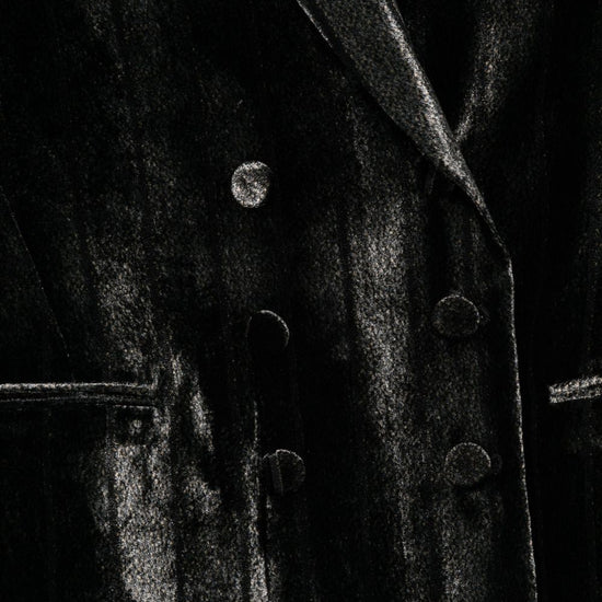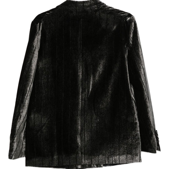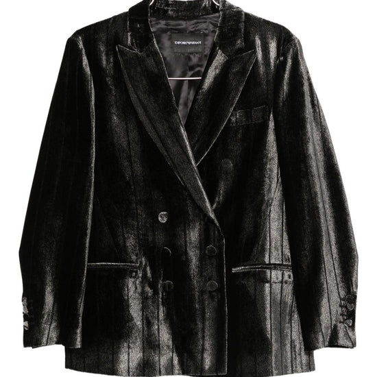 Black pinstripe pattern double-breasted button fastening notched lapels flap pockets