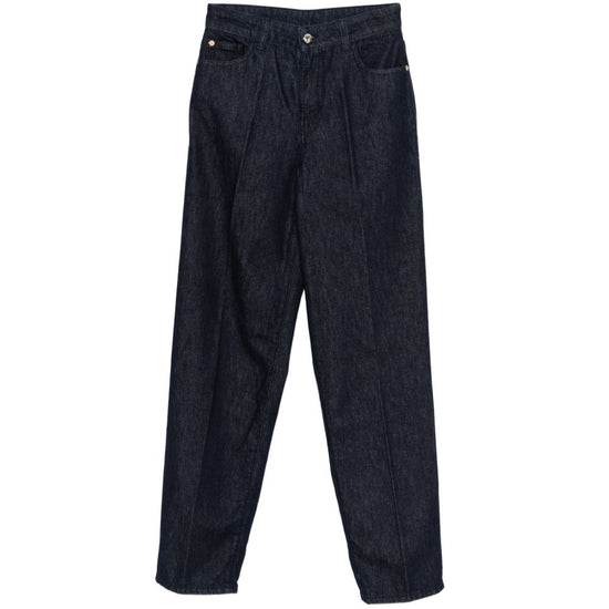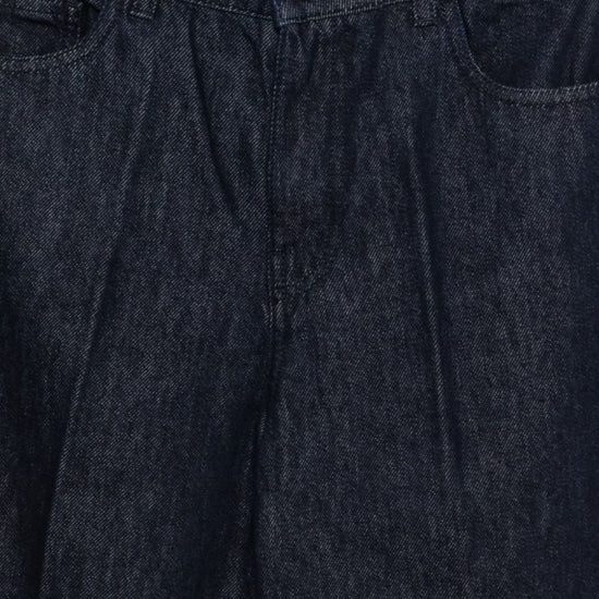 Blue pleated front button fastening slip pockets back patch tonal stitching denim cotton jeans