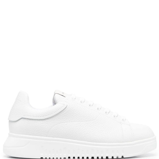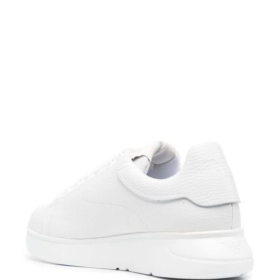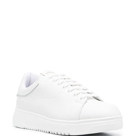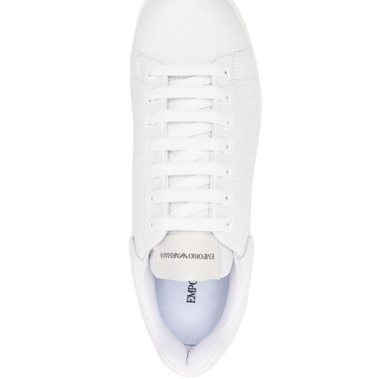 Leather low-top sneakers from emporio armani featuring white, calf leather, grained texture, logo patch at the tongue, round toe, front lace-up fastening, branded insole and ridged rubber sole. when buying this unisex item, keep in mind that it is graded in standard men's sizing.. leather sneakers size and fit - heel 1,6 in / 4 cm; platform 1 in / 2,5 cm.