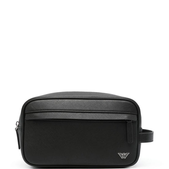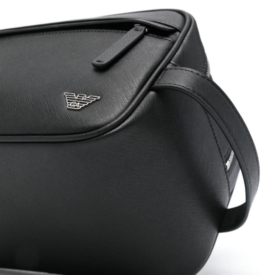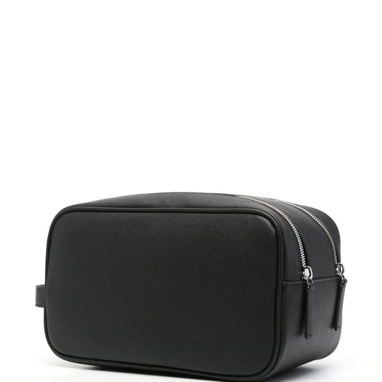Black faux leather textured finish single flat side handle front zip-fastening compartment silver-tone logo plaque two zip-fastening compartments internal card slots internal slip pocket full lining top zip fastening wash bag size and fit - depth 15 cm. handle 2.5 cm. length 15 cm.