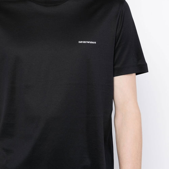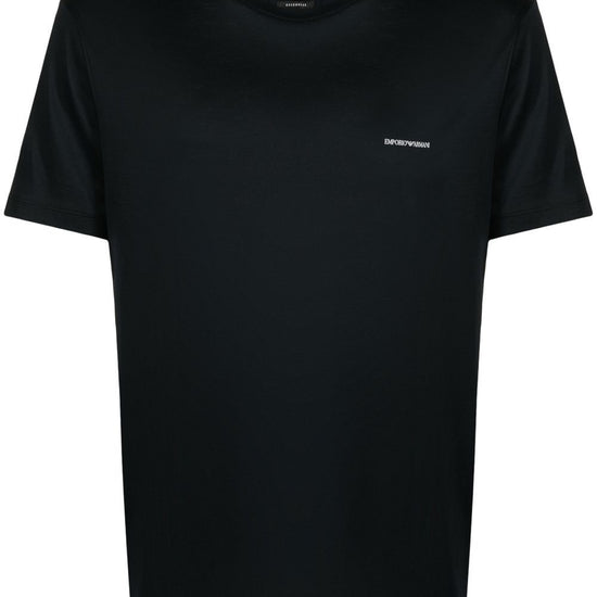 Logo-print short-sleeved t-shirt from emporio armani featuring navy blue, cloud white, lyocell blend, logo print to the front, crew neck, short sleeves and straight hem. conscious: this item contains at least 50% low-impact materials, which are certified or widely recognised as having a lower environmental impact.. logo t-shirt size and fit - this piece fits true to size. we recommend you get your regular size. model is 1,84m / 6ft 1in wearing size m