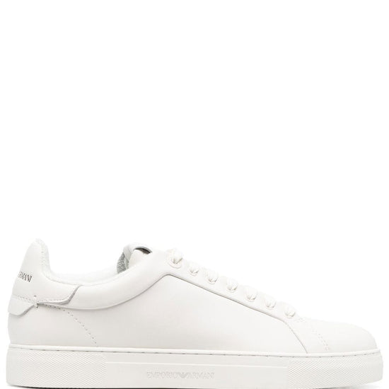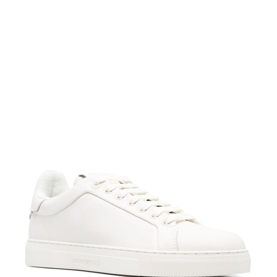 Logo-print lace-up sneakers from emporio armani featuring cloud white, logo print to the rear, front lace-up fastening, round toe, flat rubber sole and calf leather-blend. leather sneakers size and fit - heel 0,8 in / 2 cm; platform 0,8 in / 2 cm