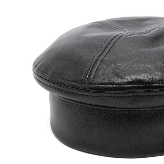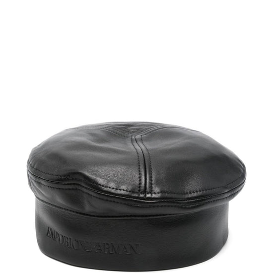 Black leather panelled design embossed logo flat crown round shape leather basque hat size and fit - brim: 5.0 centimetres. circumference: 55.0 centimetres.
