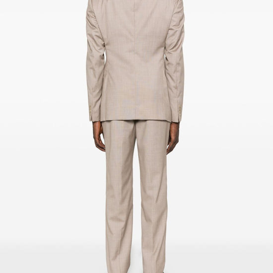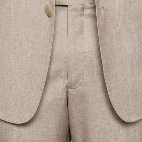 Beige button fastening notched lapel welt back-pocket trousers wool single-breasted suit