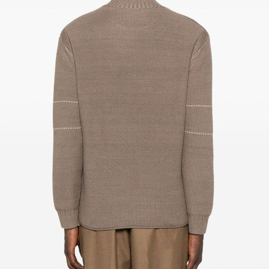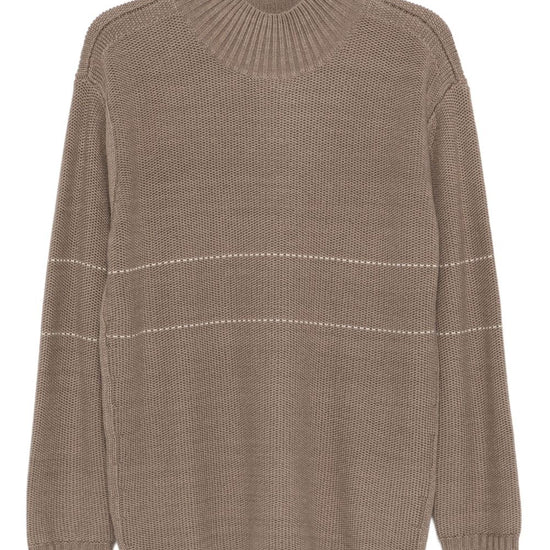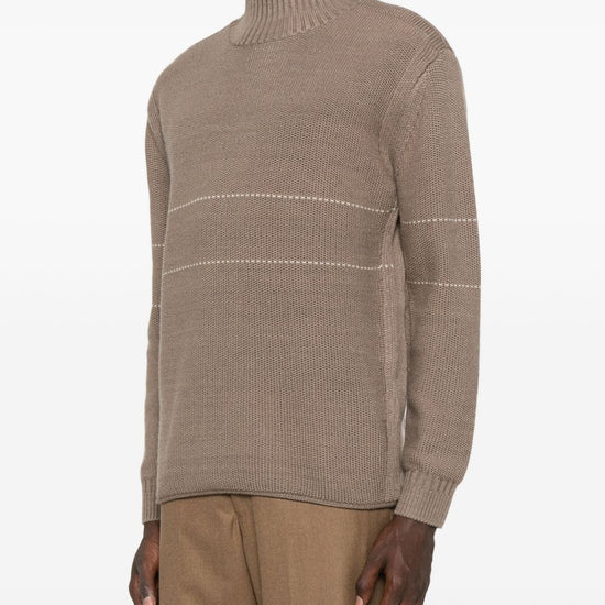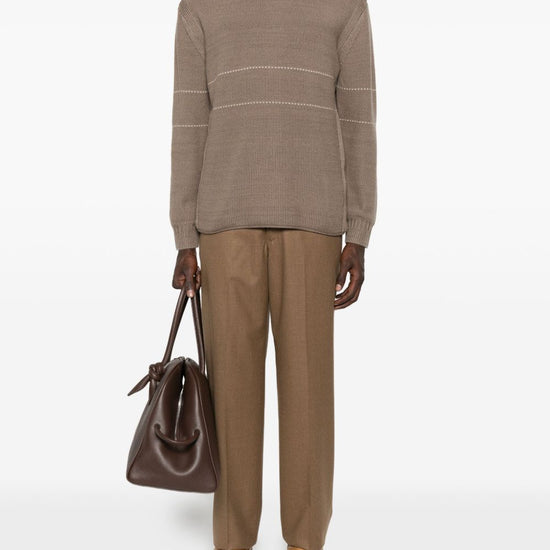 Brown ribbed knit long sleeves straight hem striped detail wool crewneck jumper
