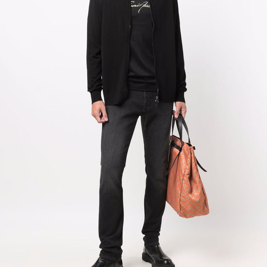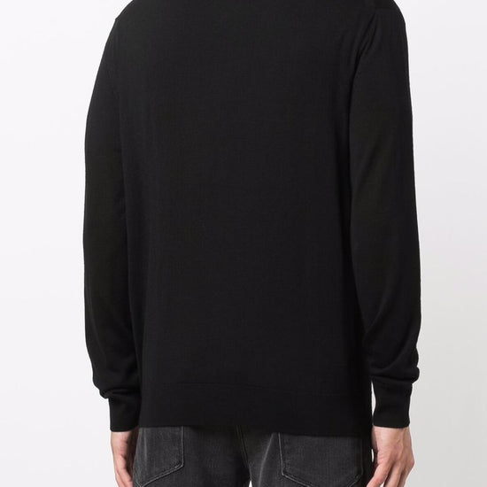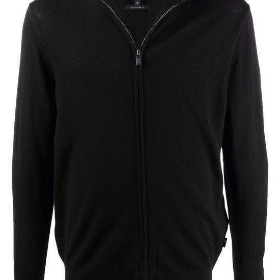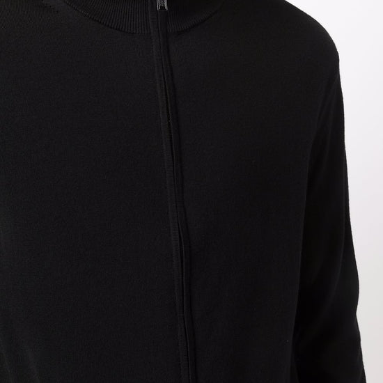 Black virgin wool zipped-front virgin wool pullover from emporio armani featuring fine knit, high neck, front zip fastening, long sleeves, elasticated cuffs and elasticated hem. wool zipped cardigan