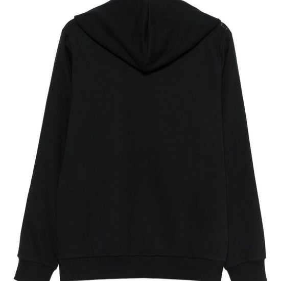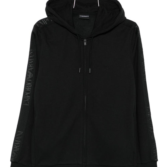 Black hooded neckline full zip fastening long sleeves logo tape sleeve detail cotton composition cotton blend loungewear hoodie