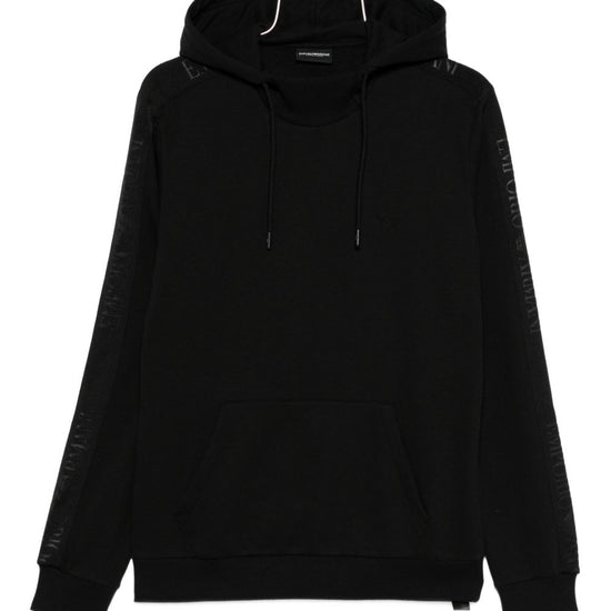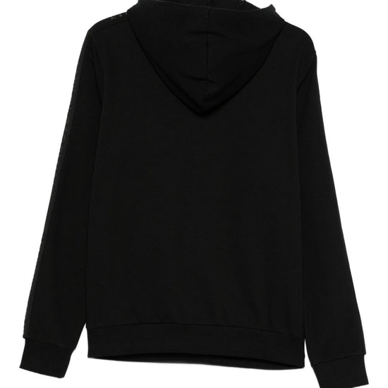 Black hooded neck kangaroo pocket long sleeves sleeve logo embellishment embroidered logo cotton blend loungewear hoodie