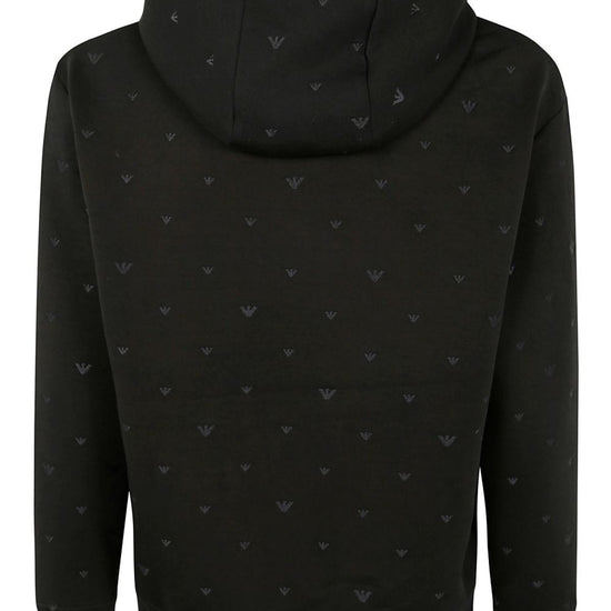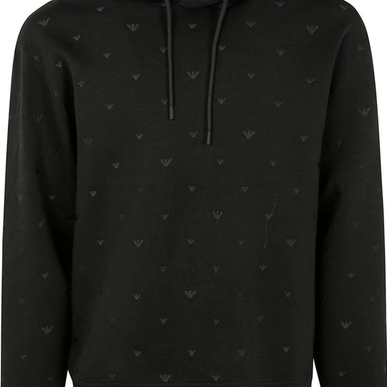 Black drawstring hood long sleeves ribbed cuffs and hem straight hem allover logo cotton sweatshirt size and fit - this piece fits true to size. we recommend you get your regular size. model is 1,84m / 6ft 1in wearing size m