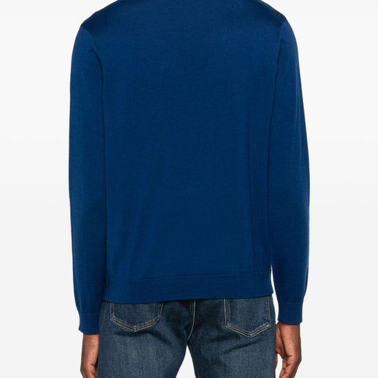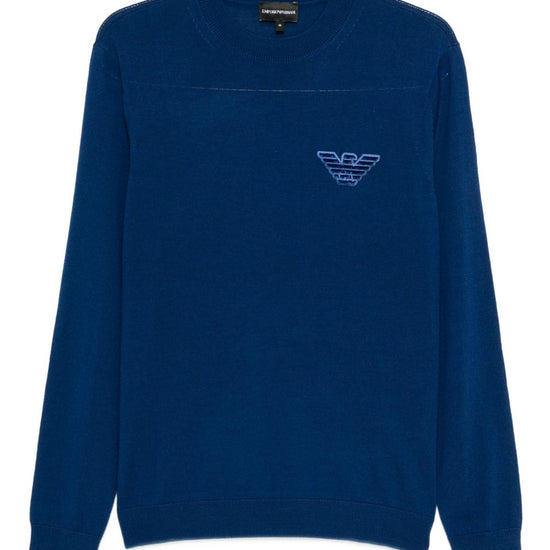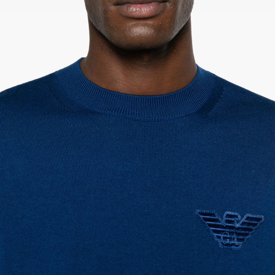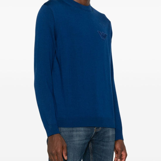 Blue embroidered logo crew neck long sleeves fine knit straight hem wool crewneck jumper
