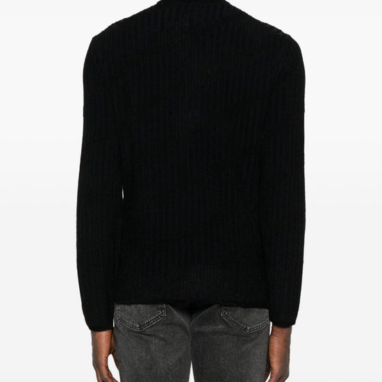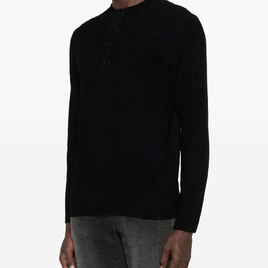 Black ribbed texture button placket long sleeves wool crewneck jumper