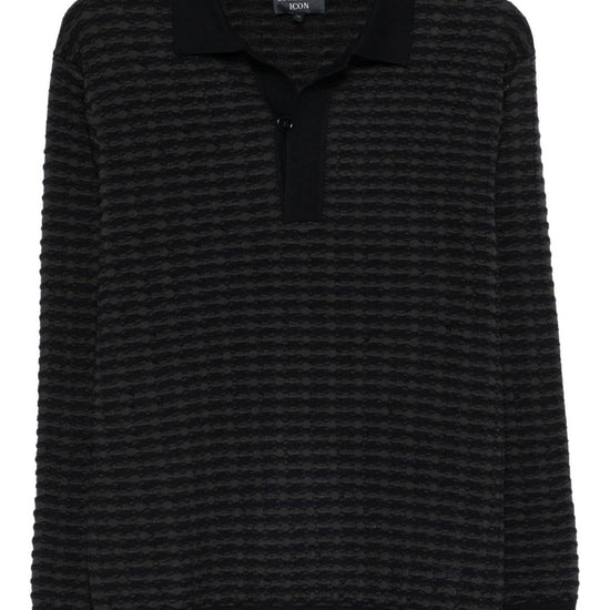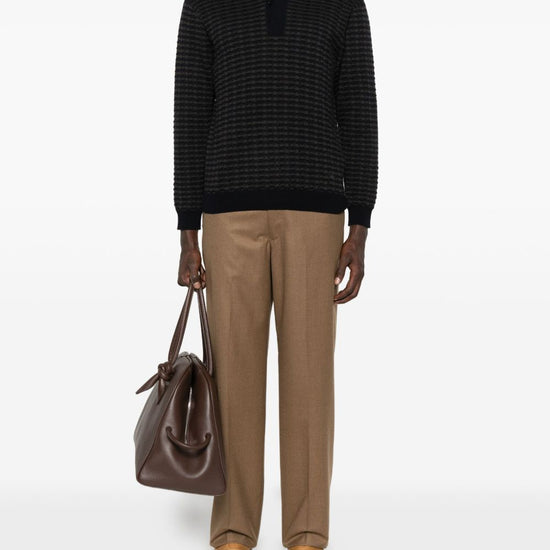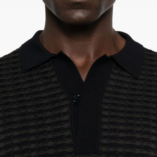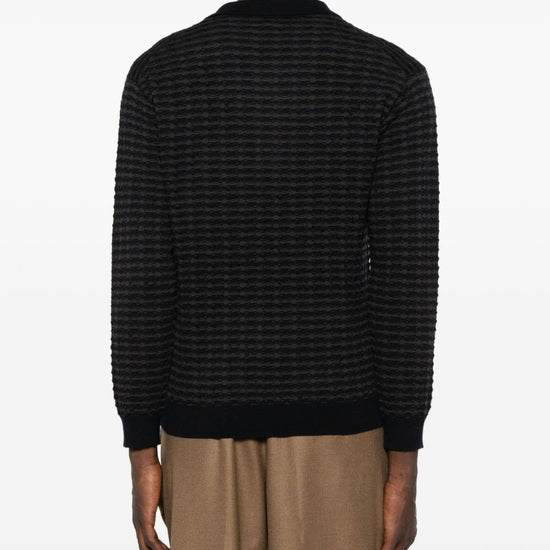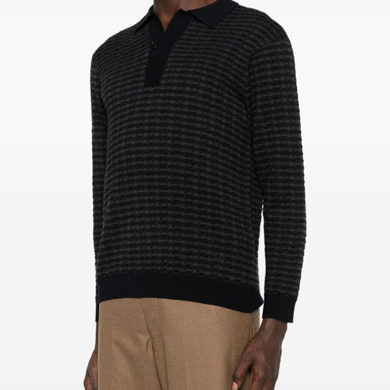 Blue wool long sleeves ribbed texture polo collar button fastening wool polo shirt
