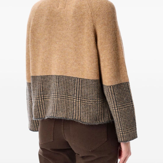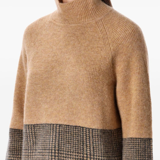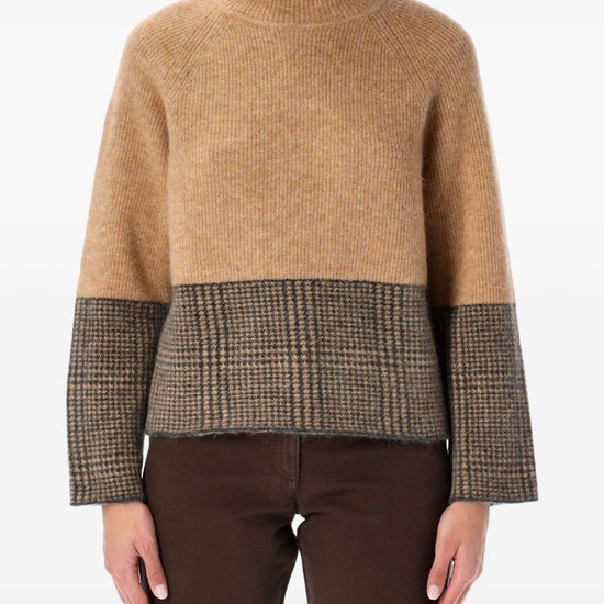 Beige check pattern turtleneck long sleeves ribbed hem ribbed cuffs wool blend turtle-neck sweater