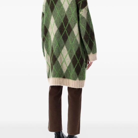 Green argyle pattern v-neck front button fastening two front patch pockets ribbed trims wool blend cardigan