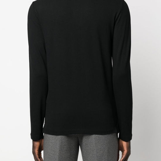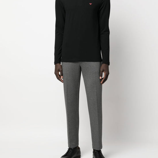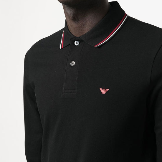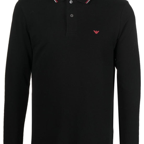 Jet-black cotton-blend polo collar front button placket long sleeves straight hem logo cotton polo shirt