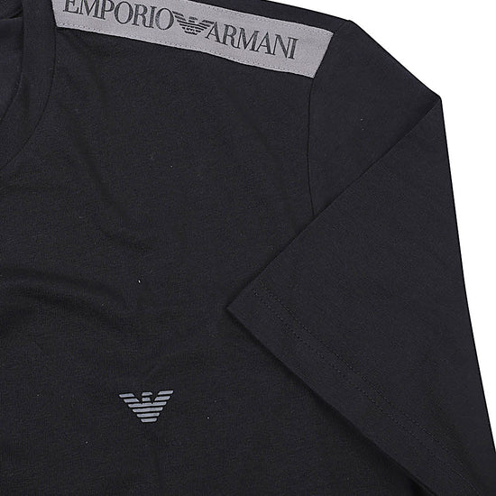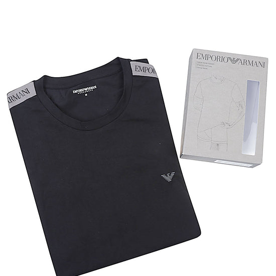 Black top, short sleeves, straight hem, crew neck, logo on the chest and shoulders.