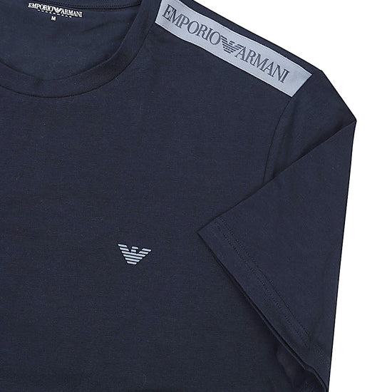 Blue top, short sleeves, straight hem, crew neck, logo on the chest and shoulders.
